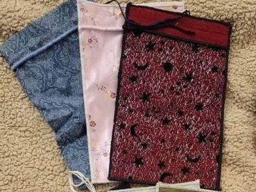 Drawstring bags for tarot cards, dice, or whatever strikes your fancy. Small bags are $10, large bags are $12. These can be customized with provided fabric or other dimensions. Price dependent on fabric and size.