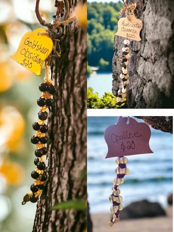A beaded crystal keychain or necklace/hanger designed for a specific intention with a spell bottle. Pre-made charms are $25. Can be customized with any gemstone, cord color, and spell intention for $35. Message us for custom inquiries!