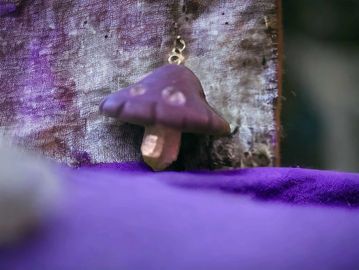 Handmade clay mushrooms with a crystal bottom and loop for a necklace hook. Pre-made mushrooms are $15. Can be customized with any top, bottom, and spot color for $20.